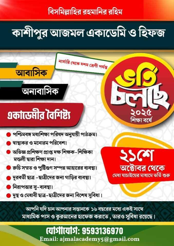 কাশীপুর আজমল অ্যাকাডেমির পক্ষ থেকে সকল অভিভাবক/অভিভাবিকা এবং ছাত্র-ছাত্রীদের আন্তরিক শুভেচ্ছা ও অভিনন্দন। ইসলামি দ্বীনি শিক্ষার পাশাপাশি পিছিয়ে পড়া ধর্ম-জাতির উদ্দেশ্যে শ্রদ্ধেয় এম.পি. মাওলানা বদরুদ্দিন আজমল সাহেবের অনুপ্রেরনায় আধুনিক শিক্ষার লক্ষ্যে আমরা যৌথ উদ্যোগে রেজিনগর কাশীপুরে আজমল সাহেবের নামানুসারে "কাশীপুর আজমল অ্যাকাডেমি এন্ড হিফজ প্লাস" প্রতিষ্ঠা করি। বর্তমানে অনেক দুস্থ মেধাবী ছাত্র-ছাত্রী আর্থিক সংকটে এবং সঠিক শিক্ষা ব্যবস্থা না পেয়ে তাদের ভবিষ্যতে এগিয়ে যাওয়ার স্বপ্ন ক্রমশ নষ্ট হয়ে পড়ছে। আমাদের লক্ষ্য এটাই ঐ সব ছাত্র-ছাত্রী যাতে পিছিয়ে না যায়। আমাদের দক্ষতাপূর্ণ শিক্ষক-শিক্ষিকাদের সহয়তায় শিক্ষাব্যবস্থাকে আরও উন্নত এবং শুদ্ধ করে তুলবো। ইনশাআল্লাহ্। যাতে তাদের ভবিষ্যতে U.P.S.C., W.B.C.S., W.B.P.S.C., NEET ডাক্তারি পরীক্ষার মত প্রতিযোগীমূলক পরীক্ষার যোগ্য ASPIRANTS তৈরি করতে পারি।